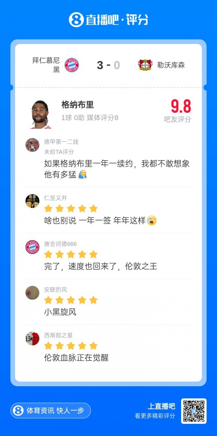 第九轮评选结果出炉,格纳布里首开记录,帮助拜仁3-0勒沃库森豪取开局15连胜!最终格纳布里获得吧友1.6万票支持,苏超直播在线观看当选【X小红书德甲第9轮最佳球员】!