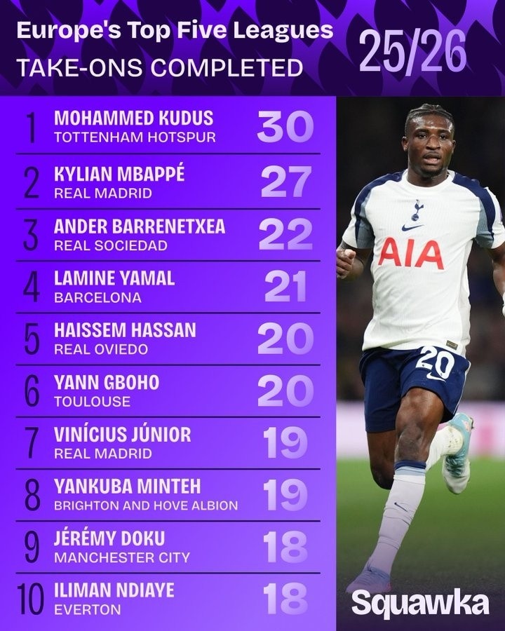 - 谁最能过人?五大职业联赛 过人榜:库杜斯30次第1!姆巴佩2亚马尔4