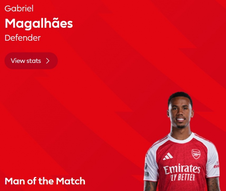 - 10次解围,英超官方:加布里埃尔当选阿森纳4-0利兹联全场最佳