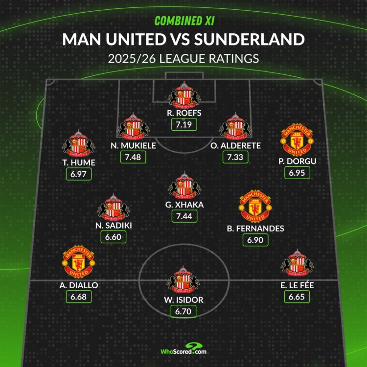 - WhoScored排曼联+桑德兰阵形 :曼联仅B费、多古、阿玛德三人在列
